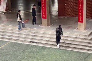 男子拄着拐杖去考试,两位考生停下看他不好上台阶 便过来帮忙